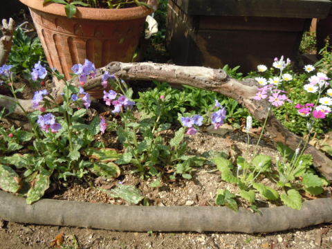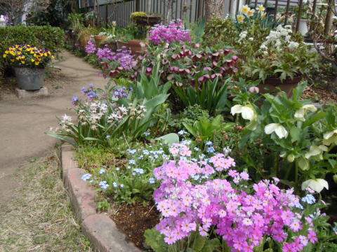 庭の東側に位置する桜草通りです。昨年暮に屋根工事、外壁工事をして足場の下で踏まれた小さな苗がここに来て元気に咲き揃いました。