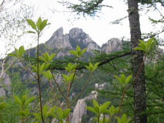 巨岩の中、アズマシャクナゲの群落(咲き始めたところ)
