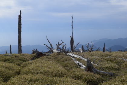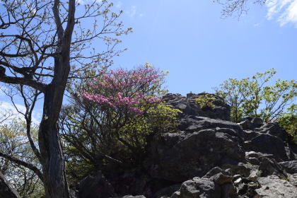 昨日、登山口近くの民宿を探し宿泊する。仲間と民宿の女将と夕食をしながら歓談し楽しい時間を過ごした。翌日朝5時民宿を出発し大台ケ原登山口に向かう。登山口は昨日と違い平日の為車も疎らである。薄曇りで風が少し冷たい中、身支度を整え時計廻りで最高峰の日出ヶ岳に向け登山を開始する。傾斜の緩い整備された道を進むと40分程で日出ヶ岳山頂に着く。山頂は広々として開放的で展望も素晴らしい。西側には昨日登った八経ヶ岳そして大峰奥駈道の山並みが望め、東側には眼下に熊野灘が望める。展望を楽しんた後、正木嶺へ向かう。この辺りになると雲が取れ快晴になって来る。特徴ある枯れ木立を見ながら正ヶ原から牛石ヶ原を通過し岸壁で有名は大蛇嵓に向かう。東大台は枯れ木立が多いが西大台は樹木が多くなる。大蛇嵓に近づくとピンクのアケボノツツジが迎えてくれた。この辺りになると木々も増え植生も大きく変わって来る。岩場を大蛇嵓先端まで足を延ばす。目の前の岸壁にアケボノツツジが映える。先端に出ると足が竦むと思っていたが想像していた程ではない。展望を楽しんだ後、シオカラ谷吊橋まで大きく下り再度登り上げて登山口に戻る。一周5時間程の山旅であった。