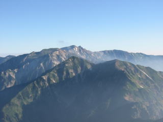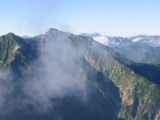 昨日の夕方、ガスが掛かっていて五竜山荘から五竜岳が見えなかったので心配したが朝起きると天気が良く、五竜岳の岩陵帯の雄姿が眼前に迫った。雲ひとつ無い快晴である。朝食を食べた後、空身で五竜岳山頂に向かった。途中まで歩き易い登山道であったが、山頂直下になると切り立ったクサリの岩場である。慎重に足を進め山頂手前の岩場に出た。この岩場から50m程先が五竜岳山頂である。山頂から続く稜線の先には見事な双似峰の鹿島槍ガ岳が望めた。南側には槍ガ岳、鷲羽岳、水晶岳、薬師岳と続く北アルプスの山並みが、南西側に立山から剣岳に続く山並みも眼前に迫った。北側には唐松岳、白馬鑓ガ岳、杓子岳、白馬岳に続く山並みが望めた。更に遥か遠方の雲海の上に八ガ岳、富士山、南アルプスの山並みも望めた。360度の大展望であった。今日の快晴に感謝したい。眺望を充分堪能した後、下山の途に着いた。五竜山荘まで降り準備を整え白岳から続く遠見尾根を下った。西遠見、大遠見、中遠見、小遠見とつづく尾根道である。五竜岳から鹿島槍ガ岳への眺望を楽しみながらの下山であった。