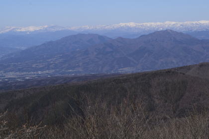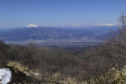 黒檜山に登るつもりであったが昨夜雪が降り路面が凍結していたので急遽鍋割山に変更した。快晴の中、姫百合駐車場より登山を開始する。昨夜の雪が登山道に数センチ積もっていた。日陰の登山道は凍結していたがアイゼンを使う程ではない。荒山高原に着くと正面に雪を被った富士山の雄姿が望めた。そして、鍋割山の稜線に出ると春の時期とは思えない程空気が澄んでいて真白く雪を被った上州武尊山、谷川岳、苗場山、本白根山、四阿山、浅間山、更に.八ヶ岳、北アルプスや南アルプスの山々も望めた。展望を楽しみながら稜線歩きを堪能した。