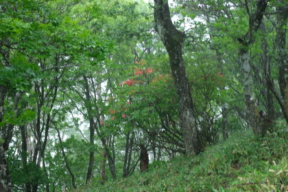 突然、天気が回復基調になったので身近な赤城黒檜山に向かう。大沼脇の駒ヶ岳登山口より歩き始めるが霧が立ち込めあまり天気が回復していない。長い階段を登り上げると稜線に出る。傾斜の緩い快適な登山道が続く。霧の中ではあるが木々の新緑が眩しい。ラジオから流れる「ヤマカフェ」を聞きながら足を進める。数少ないが時々ヤマツツジが目を楽しませてくれる。急登を登り上げると霧に包まれた駒ヶ岳山頂である。ピークより下り更に登り少し進むと黒檜山山頂である。2分程進と展望の良い場所に着く。この頃になると霧も晴れ展望も良くなる。ただこの日は谷川岳や上州武尊山の山頂付近は残念ながら雲に隠れ望めない。展望を楽しみながら休憩を取った後、駒ヶ岳経由で下山の途に着いた。何時もであれば急登を下るが初めて同じ駒ヶ岳経由の道を戻った。帰路もこちらの道の方が傾斜も緩く展望も良く快適である。下山後、レンゲツツジ咲く覚満渕を散策した後帰路に着いた。