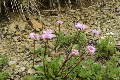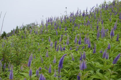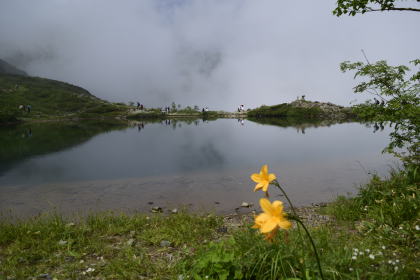 八方池山荘から八方池まで歩くのは10年以上前、唐松岳から五竜岳を縦走した時以来である。歩きながら右前方に白馬岳そして左前方に五竜岳や鹿島槍ヶ岳の雄姿を眺めたことを今でも鮮明に覚えている。ゴンドラとリフト2本を乗り継ぎ八方池山荘登山口まで昇る。整備された傾斜の緩い登山道を進む。傍らにはシモツケソウ、ウツボグサ、キンコウカ、等、多くの高山植物が咲き乱れ飽きることがない。八方尾根は高山植物の宝庫でこんなに多い登山道は記憶にない。曇り空の中時々薄日が射すがアルプスの山並みが見えない。花々が今が盛りと咲いている。1時間程で八方池に着いた。着いた途端、今迄雲に隠れていた白馬岳が突然八方池の上に姿を現した。まさに奇跡である。残念ながら20分程で曇り隠れてしまった。八方池に映る山々は何とも見事であった。