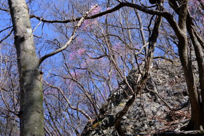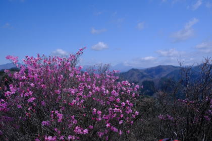 毎年この時期、アカヤシオを期待して足利の仙人ヶ岳に登るが今年は桐生の鳴神山に登る。杉林の登山道を50分程登ると明るい自然林の登山道に変わる。途中初めてリスのような動物を見掛ける。沢沿いの道に爽やかなミソサザエや鶯の声も響く。傾斜の緩い登山道を進むと左側上部の岩稜帯にピンクのアカヤシオが見えてくる。今年はアカヤシオの咲き具合が良いようである。登山口より1時間半程で山頂に着く。山頂のアカヤシオはほぼ満開である。空気も澄んでいてアカヤシオ越しに男体山、日光白根山、皇海山、袈裟丸山、上州武尊山、浅間山、等の県境の山々が望めた。以前この山のアカヤシオの満開の時期は5月の連休位であったが今は一カ月程早まった感じがする。