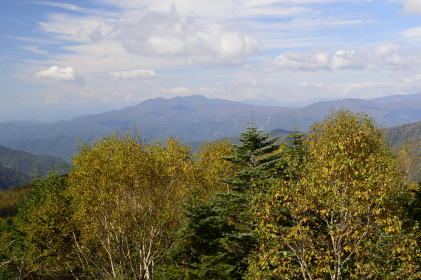 紅葉を期待し日光白根山そして丸沼、菅沼、奥日光方面に向かう。丸沼スキー場のゴンドラで一気に標高2千メートル迄昇る。天気も良く目の前に標高2,578mの日光白根山の雄姿が迫る。足湯の展望台から上州武尊山、至仏山、燧ヶ岳、等の名峰が望めた。休憩後、山頂まで登りたい気持ちになり登山道を進むが途中で引き返す。標高が高いので辺りはシラビソ等の針葉樹の森である。散策後、ゴンドラからの展望を楽しみながらスキー場を下る。その後、丸沼、菅沼、そして奥日光の湯滝、裏見の滝を散策し帰路に着く。
