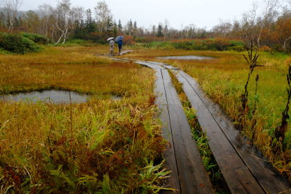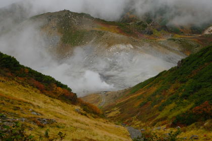 立山室堂は富山県側から車で2度行っているが扇沢から行くのは初めてである。今回行く立山黒部アルペンルートは以前から気になっていた。出発点である黒部扇沢駅に向かい朝5時出発。距離は200キロ程である。信越高速を走り扇沢に8時半到着、3時間半程掛かった。ここからバスに乗りケーブル、ロープウエー、バスと3回乗り継ぎ立山室堂に向かう。途中、大観峰からの展望が素晴らしい。正面には黒部ダムの上方に針ノ木岳、左前方には五竜岳と鹿島槍ヶ岳、等の後立山の山並みが望めた。室堂は曇り空であるが一面草紅葉が広がる。広大な草紅葉の背後に雄山、等の立山連峰の山並みが望めた。紅葉を楽しみながらみくりが池に向かう。途中、赤のチングルマが目立つ。紅葉や山並みに見惚れていると突然雪が降って来た。初雪かも知れない。紅葉を堪能した後、登りと同じ経路を下る。扇沢から今日宿泊予定の白馬のホテルに向かう。二日目、今日は朝から天気が悪く雨である。でも当初の予定通り紅葉を期待して栂池湿原に向かう。2本のロープウエーを乗り継ぎ栂池湿原に着く。湿原の紅葉は最盛期であり木道を1時間程歩き紅葉を堪能する。以前、大雪渓より白馬岳に登り、この栂池湿原に降りた事を思い出した。天気は今一であったが紅葉の室堂そして栂池湿原を楽しむことが出来た。