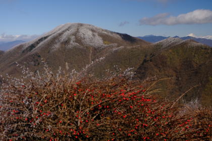 今朝は快晴であったが風が冷たく今年一番冷えたかも知れない。山々の初冠雪の便りを聞く中で富士山も観測史上で一番遅い初冠雪とのこと。少し遅いかなと思いながら赤城の紅葉状態が気になり車を走らせる。鍋割山登山口のある姫百合駐車場の標高1000m付近が最高の紅葉状態かも知れない。道路脇の紅葉が光に反射して輝いている。新坂峠に着く頃は枯れ葉の木々が目立つ様になる。突然、目の前に霧氷の黒桧山が現れる。山頂も今朝はかなり冷えた様である。撮影場所が気になり大沼周辺の紅葉の木を探す。紅葉の最盛期の木が見つかり霧氷の黒桧山を入れ撮影する。自分なりには面白い写真になった気がする。撮影後、八丁峠より地蔵岳に登り遠方そして眼下の展望を楽しんだ後下山し小沼脇より長七郎山に登る。山頂には誰もいなかった。風が冷たく非常に寒い赤城山であったが紅葉や霧氷が見え写真撮影には最適の山行になった。