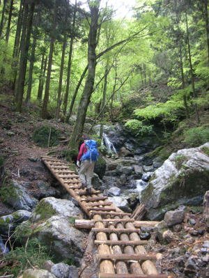 新緑の中、居合沢を左右に何度も渡る