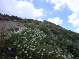 北岳にしか咲かないキタダケソウであるが時期が遅く自然の中では見ることができなかったが、肩の小屋の主人が小屋の脇でキタダケソウを管理していた。左の写真の左側の白い花はハクサンイチゲであるが、右下の少し小さい花がキタダケソウウである。花弁は似ているが葉の形が全く違うので明白である。
