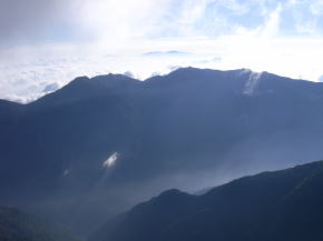 朝3時半頃から部屋が賑やかになる。この小屋の朝食は早く4時頃から始まる。我々も朝食を食べた後、小屋の外に出る。4時40分がご来光である。鳳凰三山の観音岳の上から朝日が昇る。外は少し暗いが、空気が澄んでいて快晴は間違いない。北側にはカコウ岩で真白な岩肌の鋭鋒、甲斐駒ガ岳が望める。その左側には仙丈ガ岳、右側には鳳凰三山が、そして肩の小屋の上には岩稜帯が北岳山頂まで続いた。南東側には雲海の上に優美な富士山の姿が浮かんでいた。ご来光を堪能した後、肩の小屋を後に、岩稜帯を山頂に向かった。足元にはハクサンイチゲ、イワツメグサ、そしてチョウノスケソウ等が目を楽しませてくれた。山頂手前の岩場で幸運にもブロッケン現象に遭遇した。今回は不思議にも山頂に行くまで長い時間楽しませてくれた。ブロッケン現象に遭遇するのは常念岳以来である。北岳山頂からは360度の大展望であった。仙丈ガ岳の右側は槍ガ岳を添えた北アルプスも遠望できた。