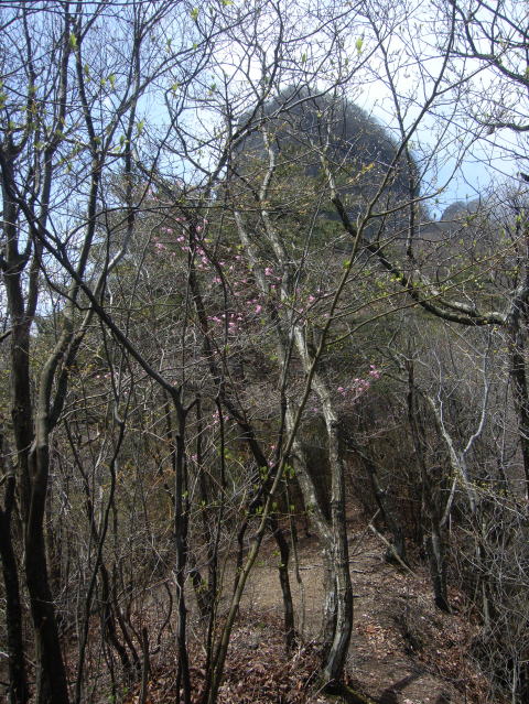 アカヤシオの背後に垂直に立つ一ノ岳を仰ぐ
