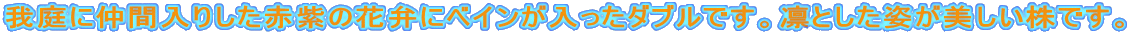我庭に仲間入りした赤紫の花弁にベインが入ったダブルです。凛とした姿が美しい株です。