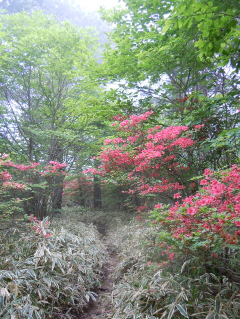 先週はミツバツツジで満開の黒檜山に登ったが今日はヤマツツジを期待して森林公園より登る。歩き始めて20分程するとヤマツツジが見えて来る。咲き具合がどの位か心配であったが、今年は花の数も多く時期も最適で満開のヤマツツジが我々を迎えてくれた。かみさんと歩くのは久しぶりな感じがする。昨年の東北の山以来かもしれない。赤城のツツジの見事さは日本でも有数の感じがするが、ツツジの種類によって咲く場所が全く異なるのが面白い。今日の散策路にはヤマツツジ以外のツツジは殆ど咲いていない。その代わりヤマツツジの数は多く、登山道わきのツツジの殆どがヤマツツジである。僅かにレンゲツツジやベニサラサドウダンツツジも咲いていた。