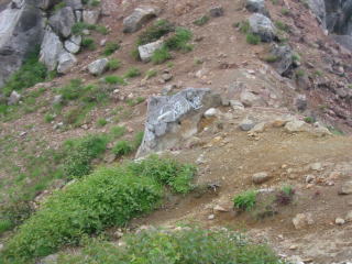 傾斜のきつい岩の登山道を1時間20分程登り詰めると南峰と北峰の鞍部に出た。突然目の前が開け、澄んだ水を湛えた火口湖が現れた。南側には今にも崩れそうな南峰(登山禁止)が聳え、北側には、噴煙を出している北峰が眼前に迫った。山頂付近は奇岩とも思える尖った岩がいくつも聳えていた。また、噴煙は異様な臭いで、何か危険な感じさえした。鞍部から北峰下部の右側をトラバースして登って行くと、上高地方面からの登山道と出合い、噴煙の湧き出ている岩の右側を登りつめると、焼岳の北峰山頂に着いた。歩き始めてから3時間30分であった。